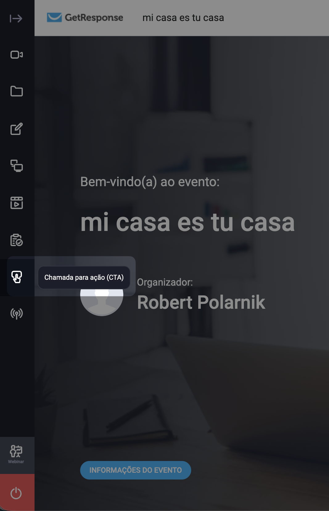 - Na sala do seu webinar, no menu do lado esquerdo, clique em Chamada para ação (CTA).