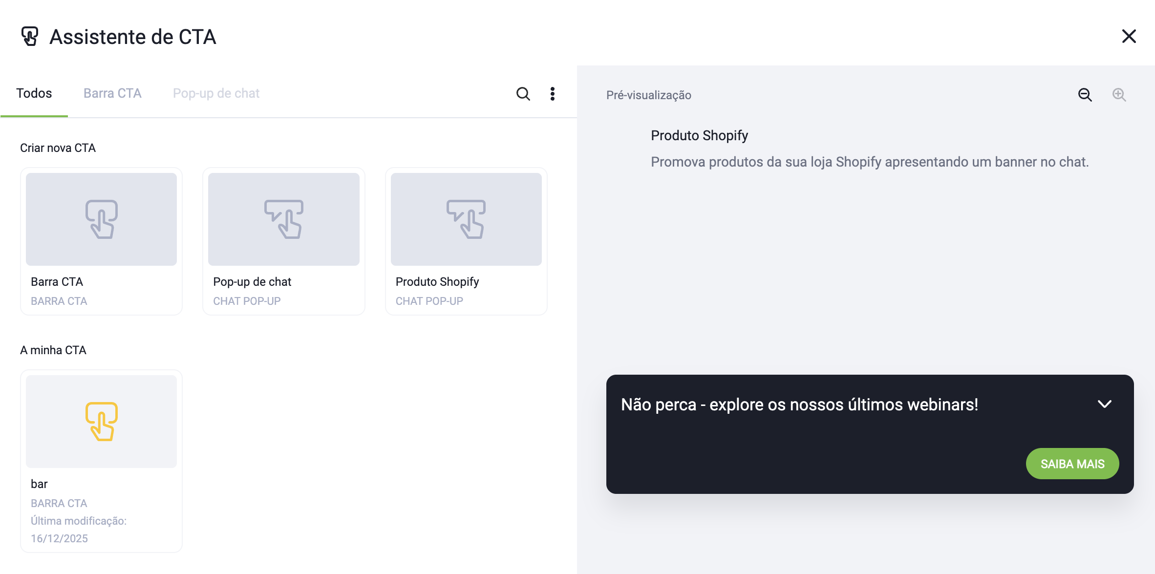 Não é possível gerenciar barras de CTA ou Chat Pop-ups fora da sala do webinar, mas todos os CTAs salvos podem ser ativados posteriormente durante outros eventos ao vivo.