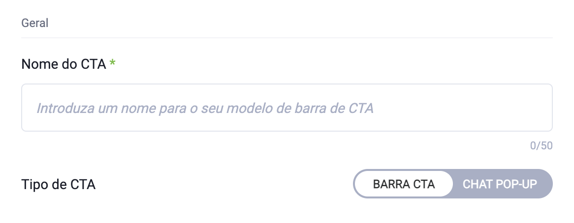 - insira o nome do CTA – visível internamente para o seu modelo de barra/pop-up