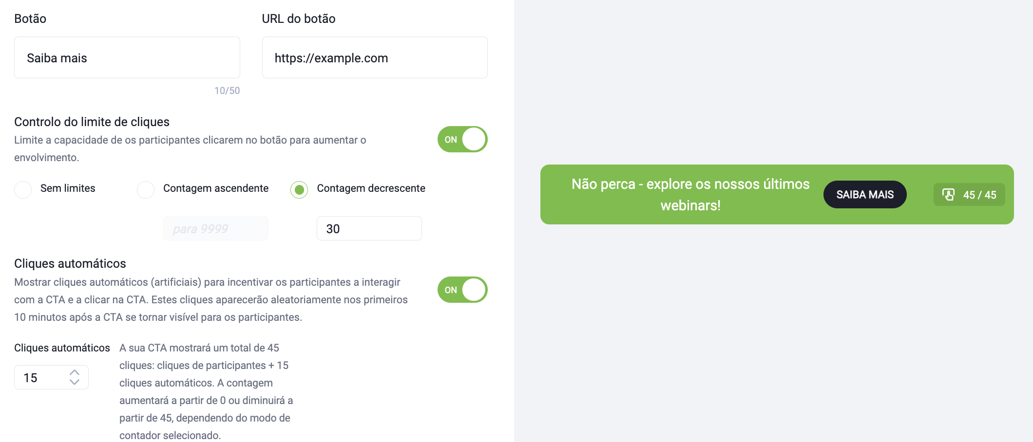 - Quando o controle de limite de cliques estiver ativado, você também poderá ativar os cliques automáticos usando o botão ON/OFF. Isso gera cliques simulados (não reais) para criar atividade inicial e incentivar os participantes a interagir com o CTA. Esses cliques artificiais são adicionados além do limite de cliques configurado – por exemplo, se o limite for definido como 45 cliques, o contador exibirá 45 cliques reais dos participantes mais cliques adicionais com base na quantidade que você configurar. Os cliques artificiais são distribuídos aleatoriamente nos primeiros 10 minutos após o CTA se tornar visível.