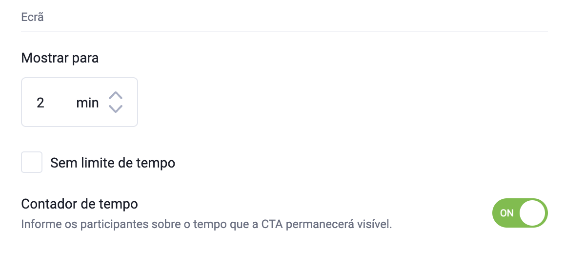 - Na seção Ecrã, a opção Sem limite de tempo está ativada por padrão, o que significa que o CTA ficará visível o tempo todo. Você pode desmarcar essa opção e definir por quanto tempo ele será exibido, além de decidir se deseja informar os participantes sobre a duração da visibilidade do CTA.