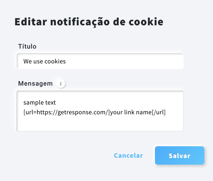 - Clique no link Editar notificação de cookie para alterar o título, a mensagem, o texto do link de recusa e o texto do botão de confirmação. Para incluir um link na sua notificação de cookies, use o seguinte formato:
