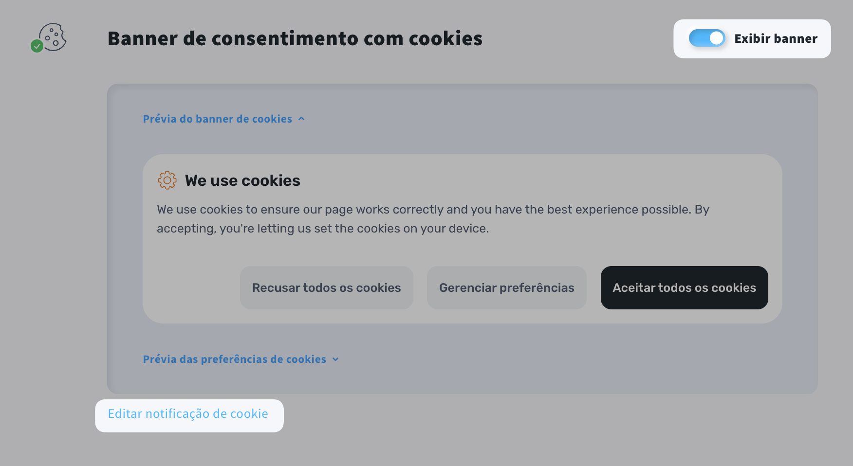 - Role a página até a seção Banner de consentimento de cookies e ative a opção Exibir banner.