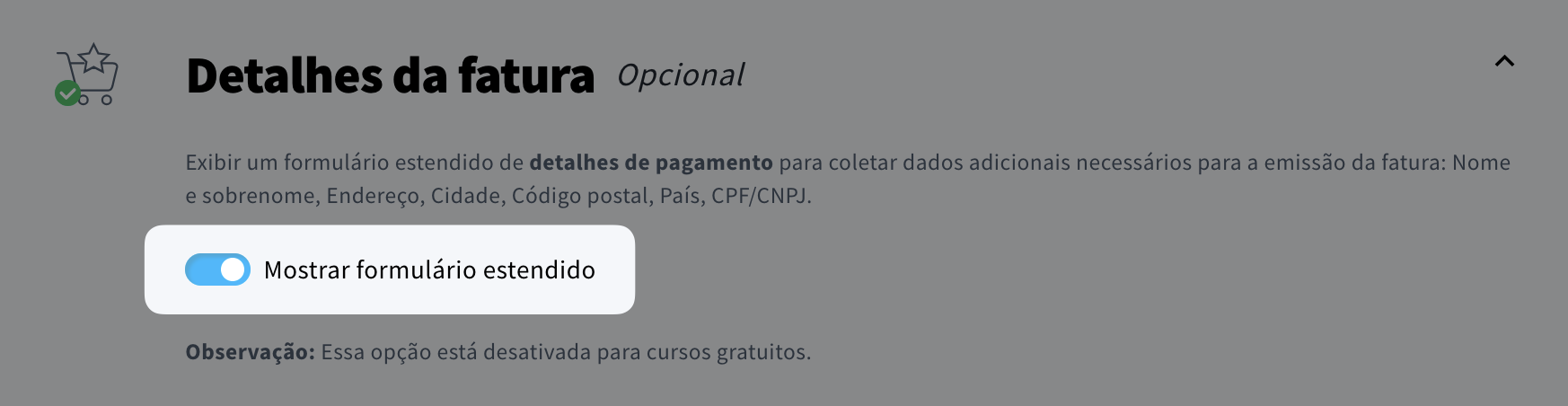 - Você também pode ativar um formulário estendido de detalhes de pagamento para coletar o nome da empresa, o NIF de IVA e o endereço. Os dados são enviados diretamente para o Stripe e ficam acessíveis na conta. Role para baixo até Detalhes de fatura e mova o controle deslizante ao lado de Mostrar formulário estendido para ativá-lo.