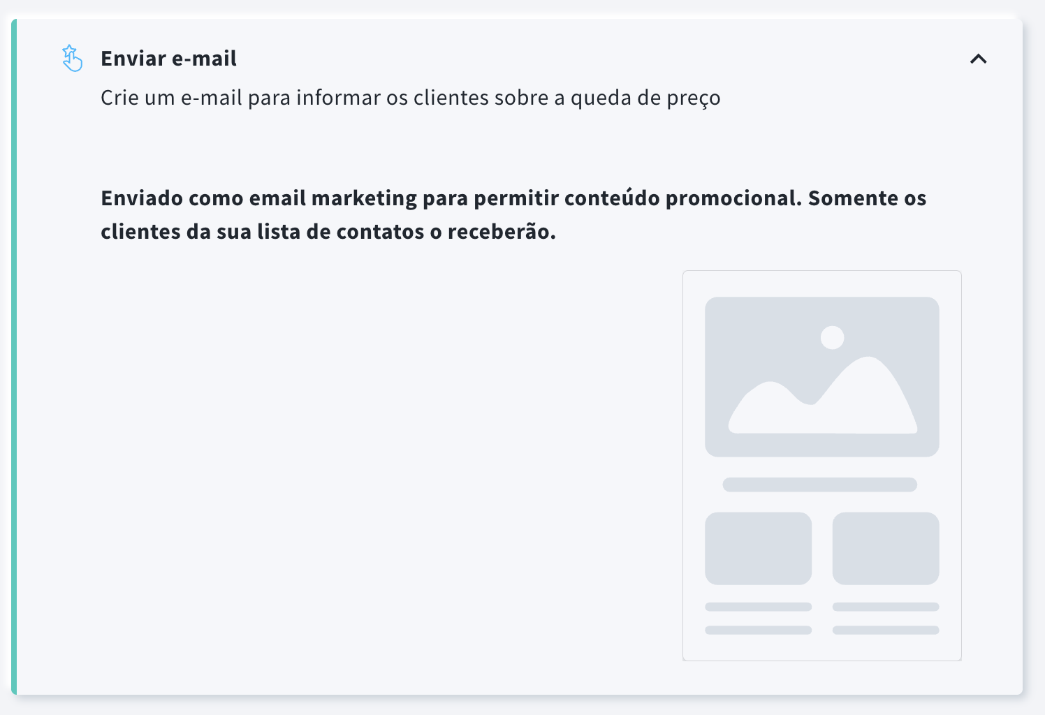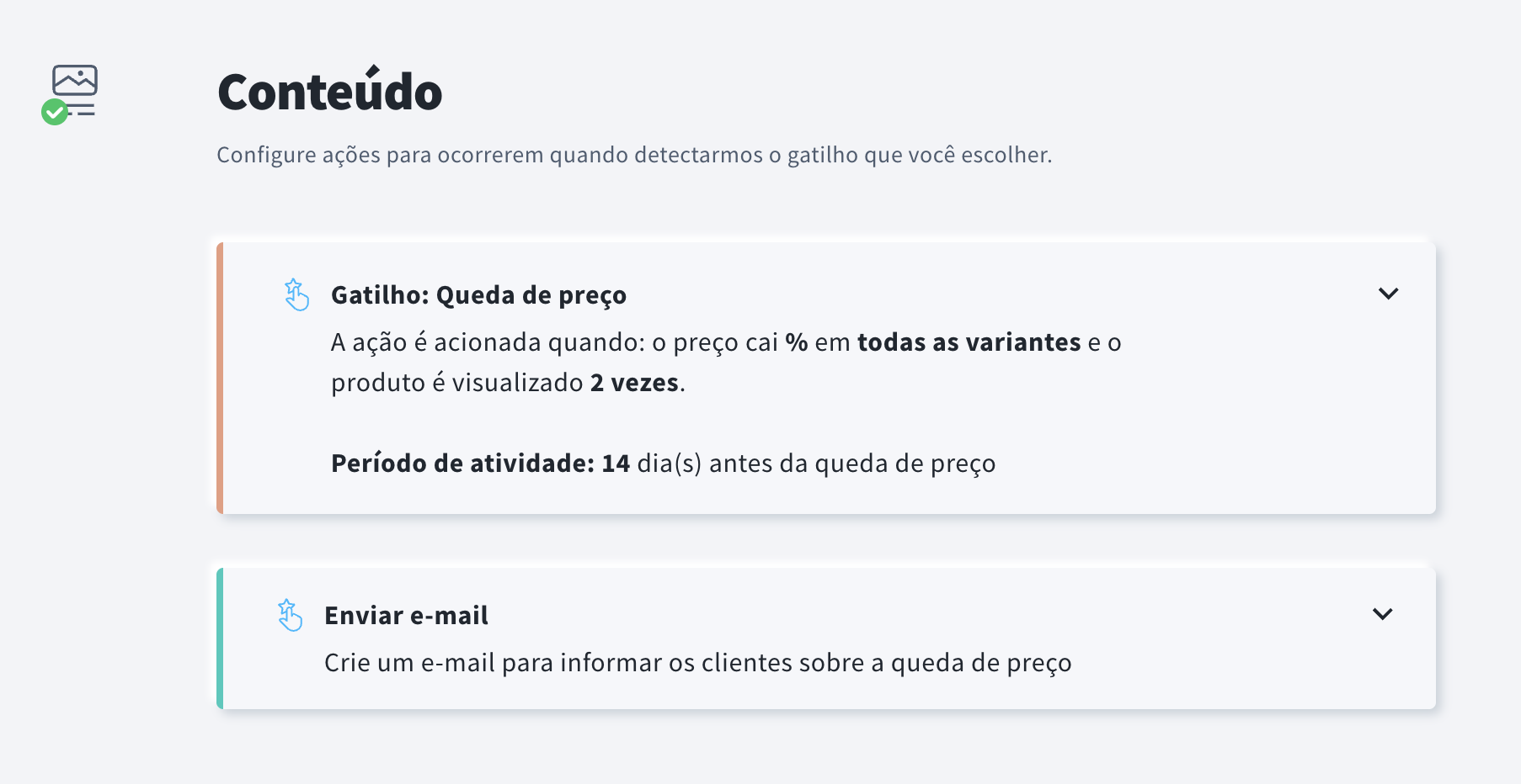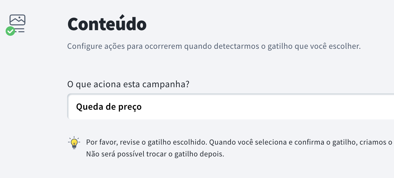 - Na seção Conteúdo, selecione o gatilho da campanha: Queda de preço.