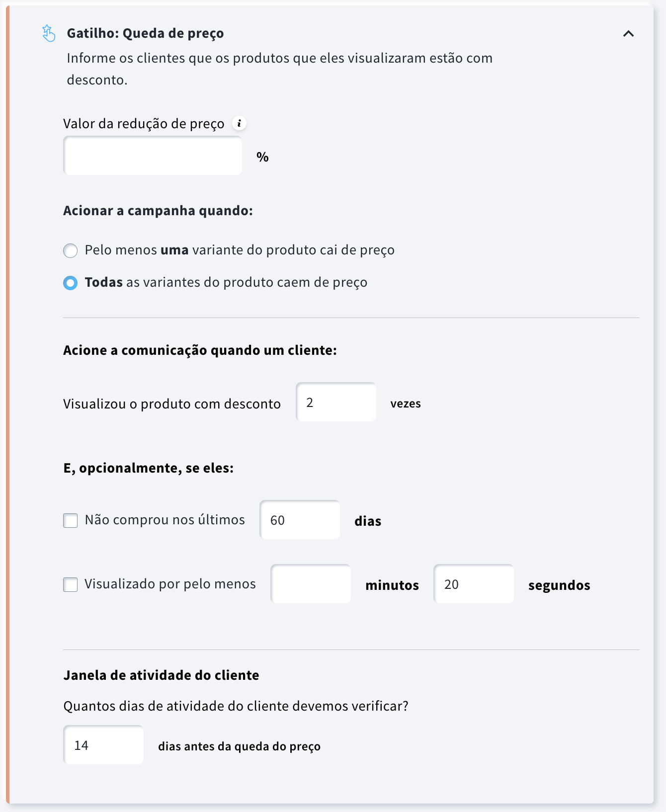 Nota: As campanhas de Queda de Preço são acionadas atualmente apenas quando o preço regular (padrão) do produto é alterado (editado). Quedas de preço originadas de descontos ou promoções ainda não estão incluídas.