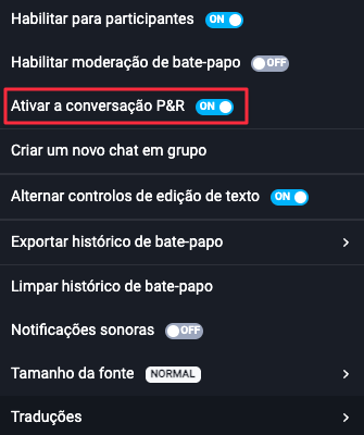 Para ativar o modo Q&A, abra as definições do chat e alterne a opção Ativar a conversação P&R.