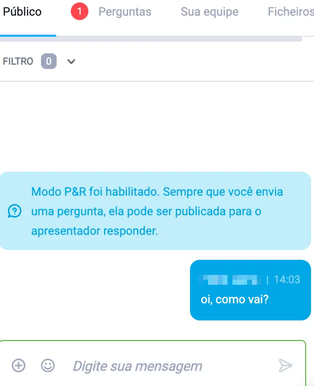 A janela de chat, disponível no canto inferior direito da sala do webinar, permite que o organizador, os apresentadores e os participantes interajam trocando mensagens de texto. Para enviar uma mensagem na janela de chat, clique na barra de entrada de mensagens, escreva a sua mensagem e pressione Enter. Também pode adicionar emojis para tornar a interação mais dinâmica e expressar emoções de forma mais eficaz. Para isso, clique no pequeno ícone de emoticon disponível na barra e escolha entre centenas de sugestões.