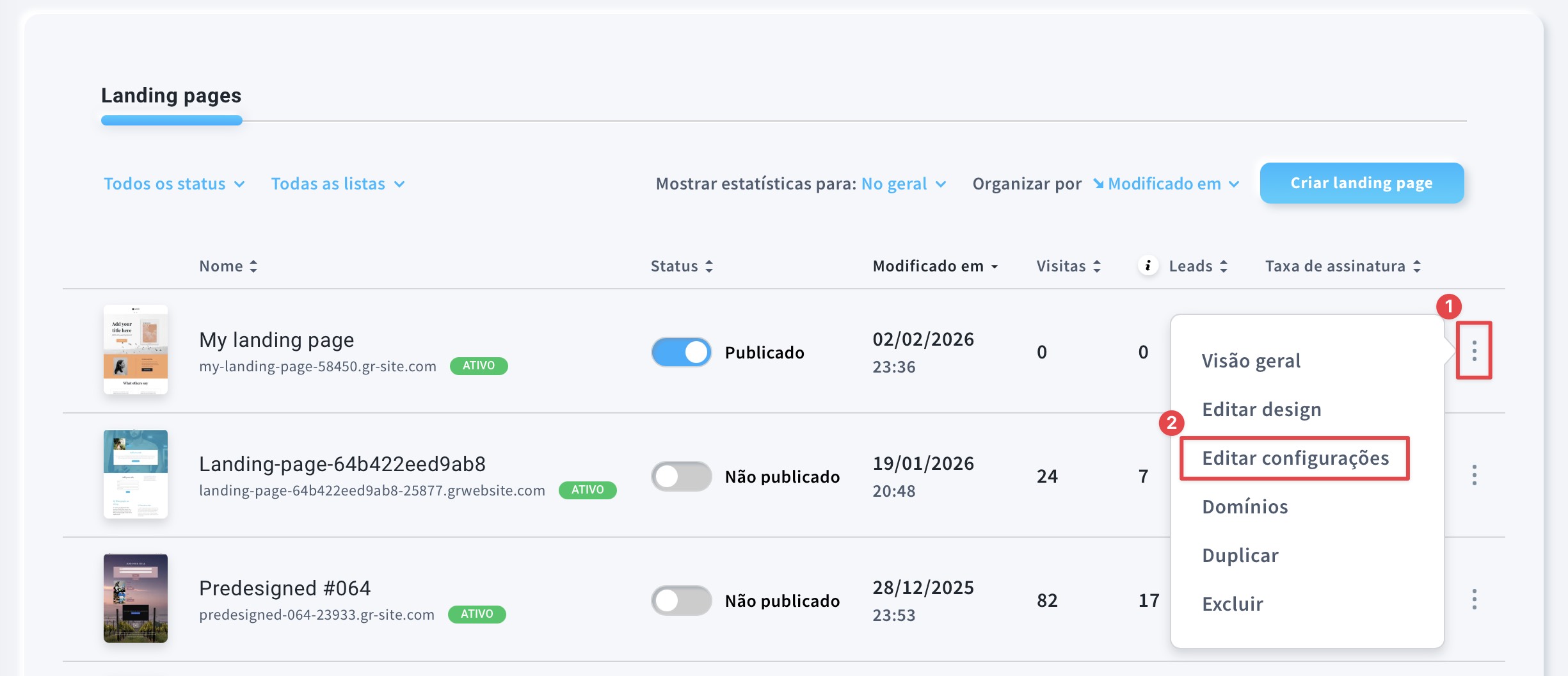 - Selecione a sua página de destino, passe o cursor sobre o menu de ações e escolha Editar configurações.