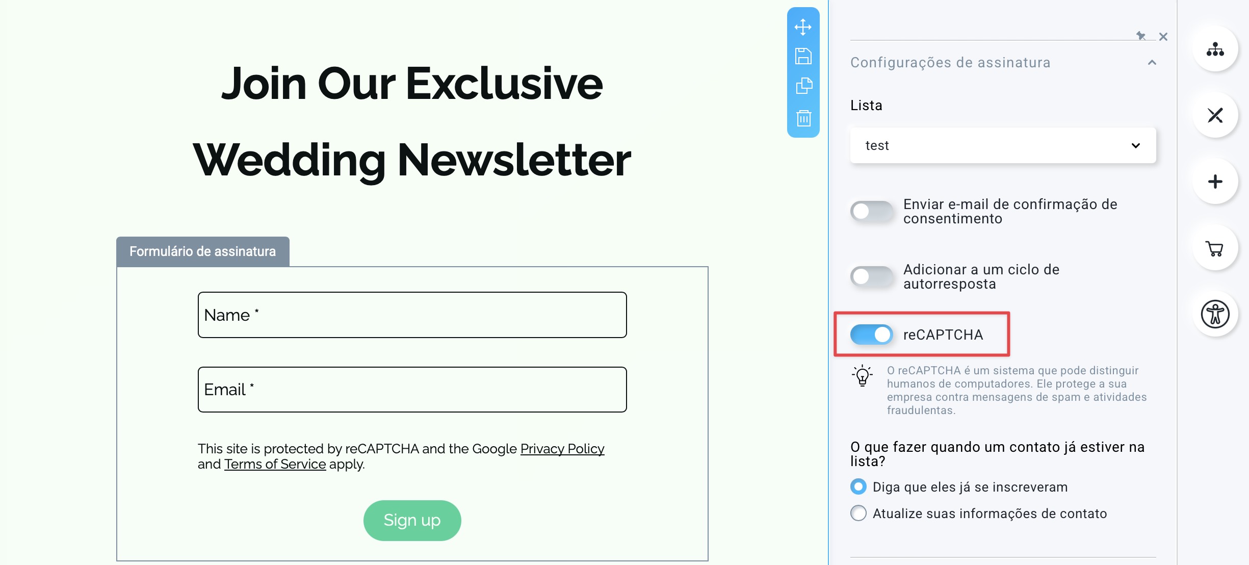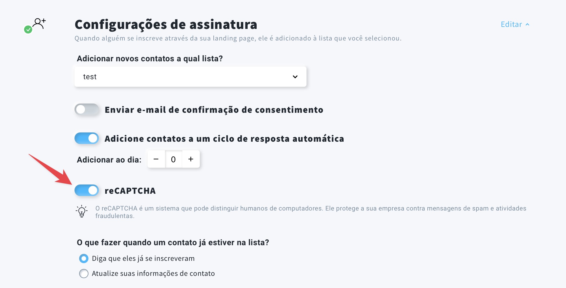 - Desça até a seção Configurações de assinatura e ative a opção reCAPTCHA.