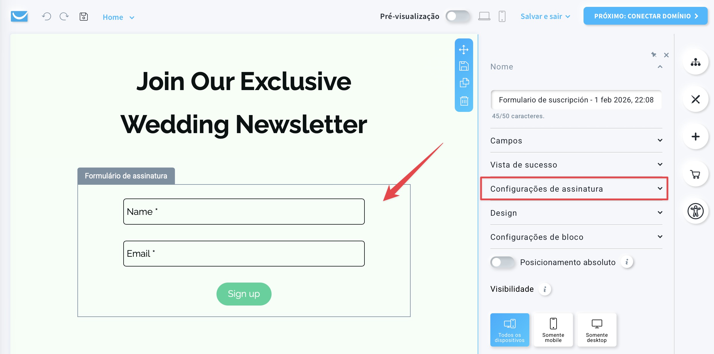- Clique no elemento do formulário de inscrição e abra a guia Configurações de assinatura.