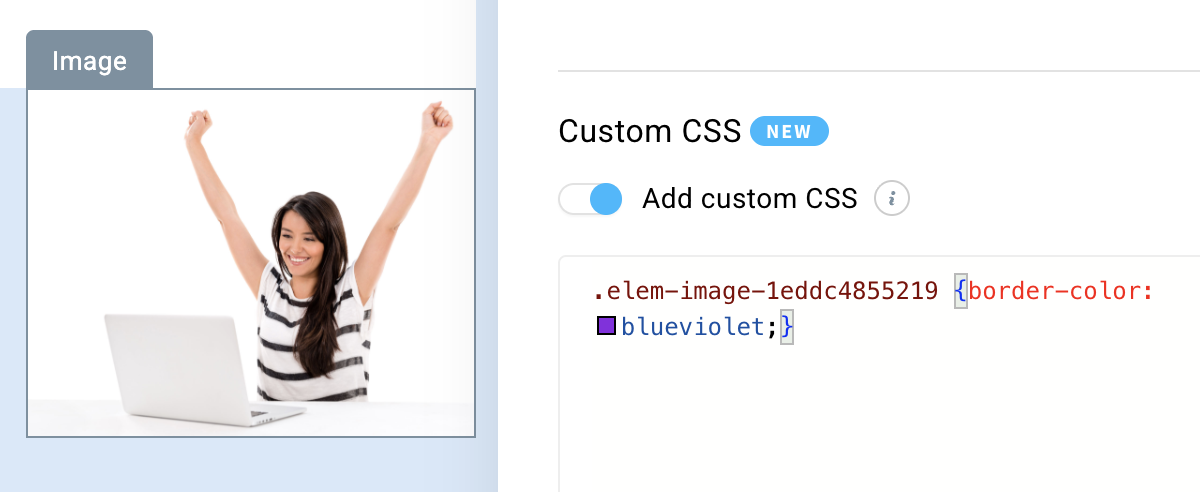 Cuando haces clic dentro del editor y escribes un punto (.), verás el ID único del elemento; por ejemplo: .elem-image-abcdef1234 { }.