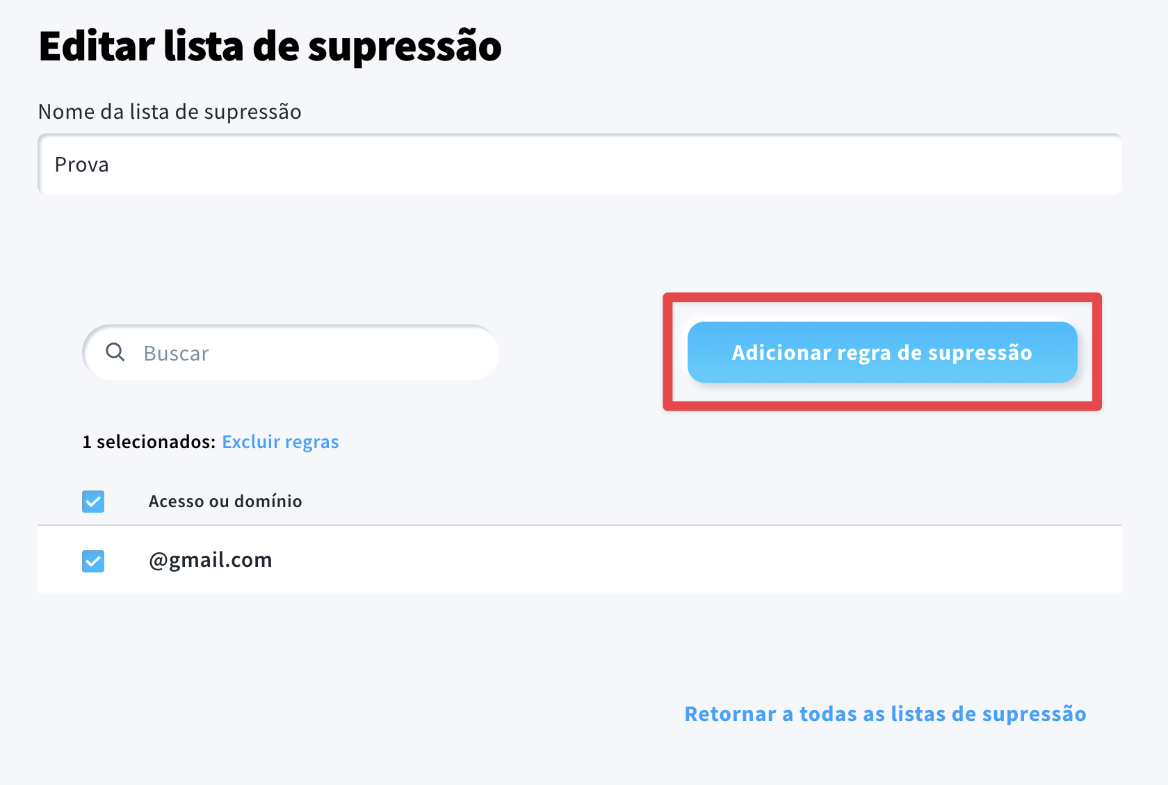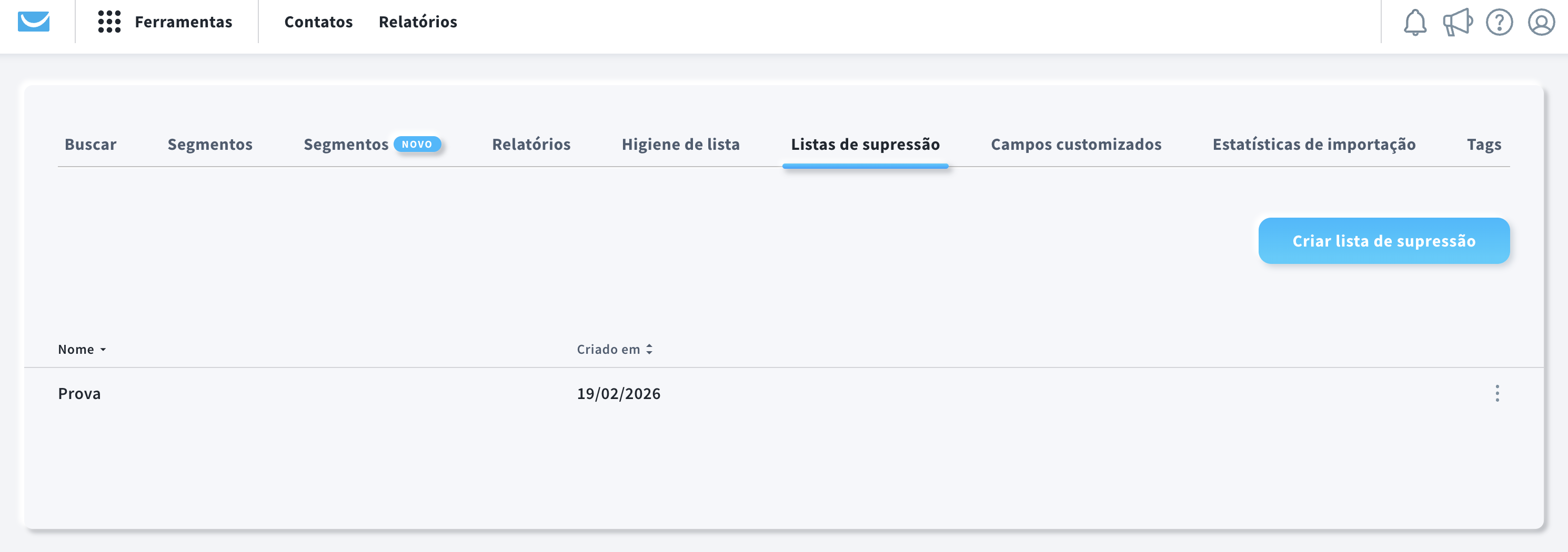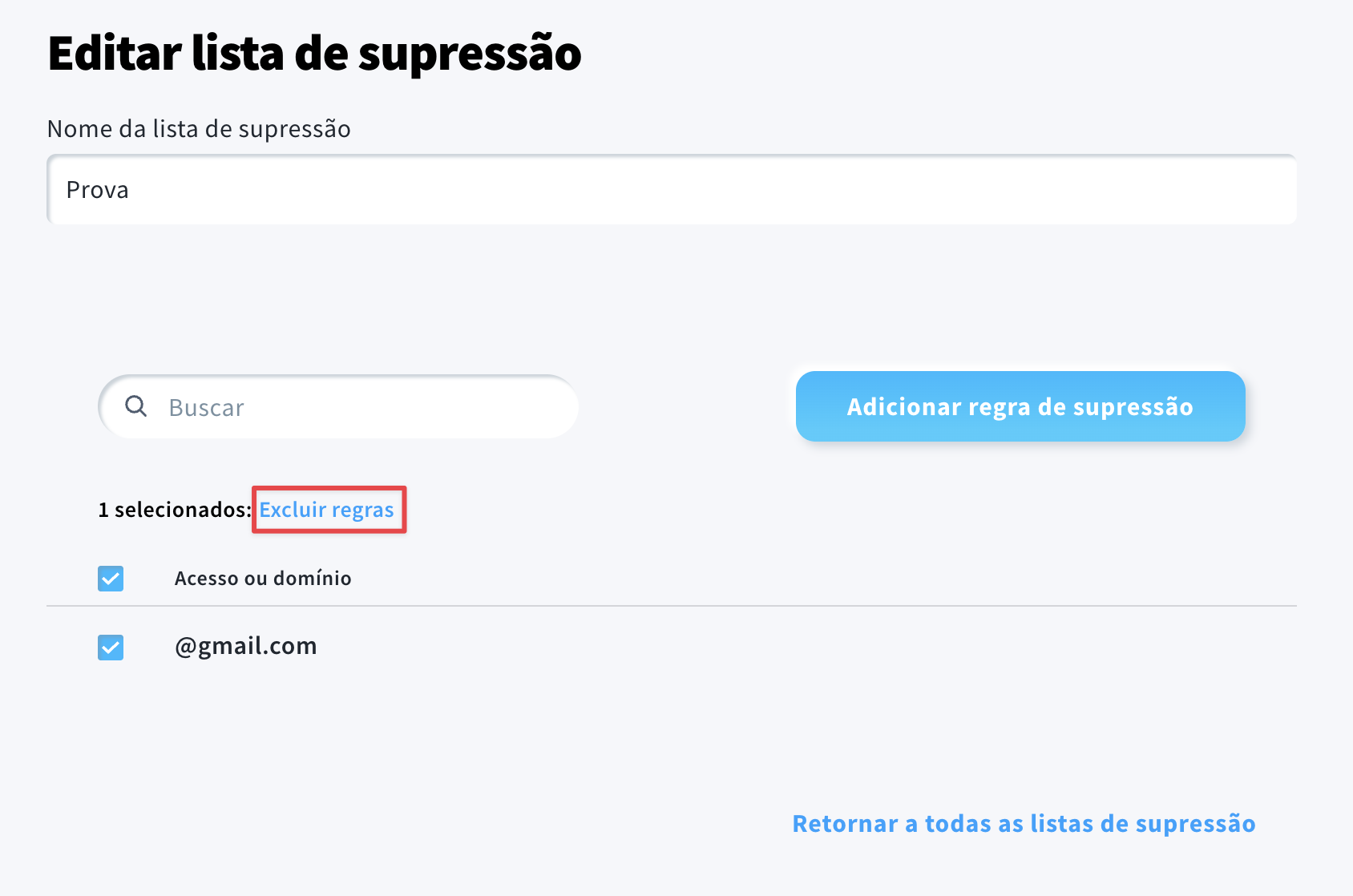 Depois de criar com sucesso uma lista de supressão, será automaticamente redirecionado para a página Listas de Supressão.