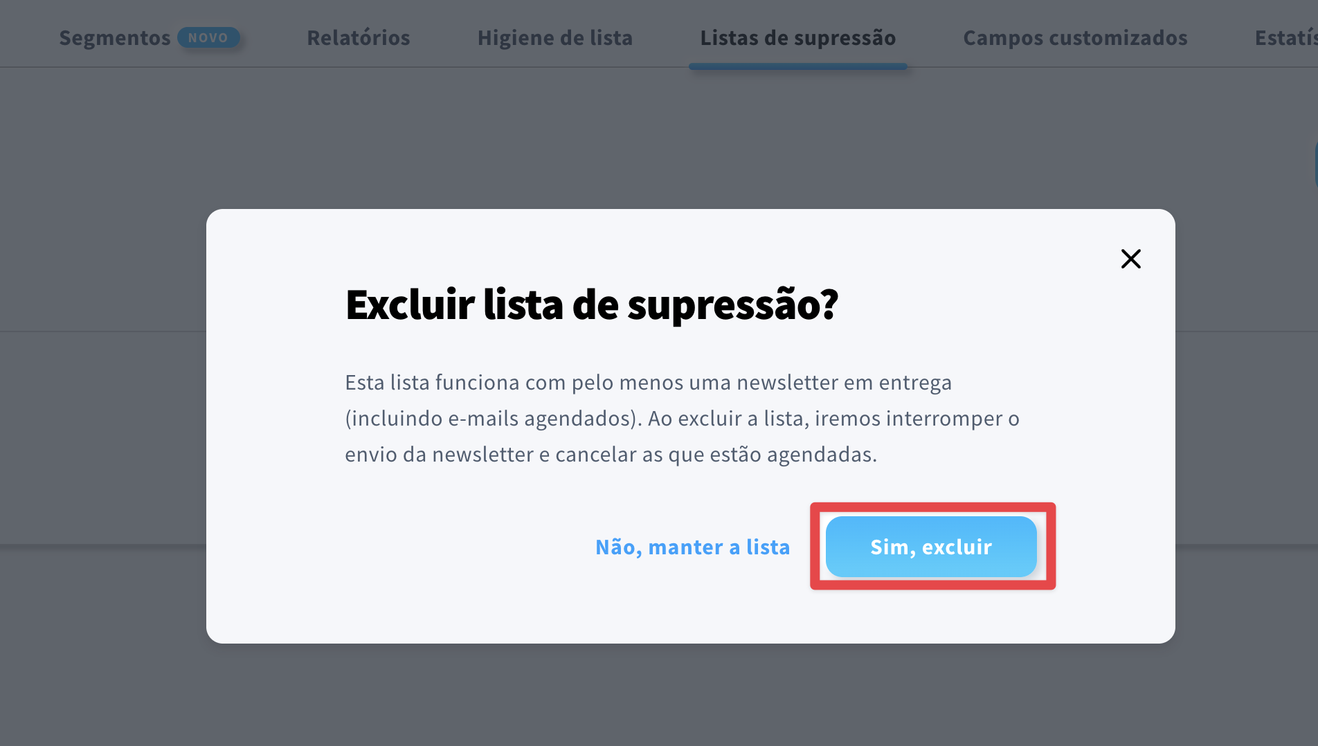 - Clique em Sim, excluir para confirmar que pretende remover a lista de supressão.