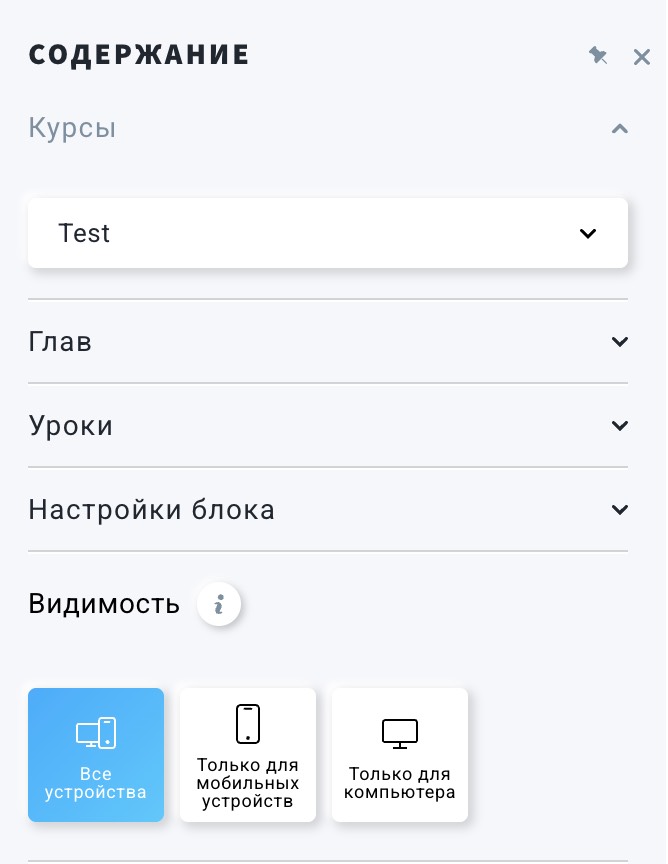 - Блок «Содержание» можно использовать для отображения глав и уроков курса на лендинге или сайте. Его использование полезно, если вы хотите ознакомить потенциальных клиентов с содержанием вашего курса.