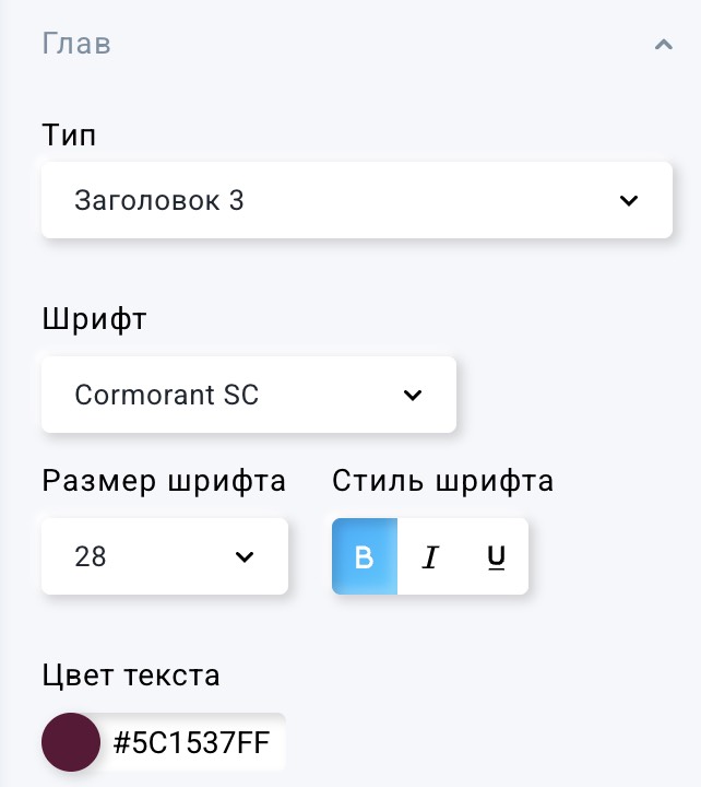 Вы можете редактировать стиль текста глав: их тип, шрифт, размер шрифта, цвет текста, а также использовать жирный, курсив и подчёркивание.
