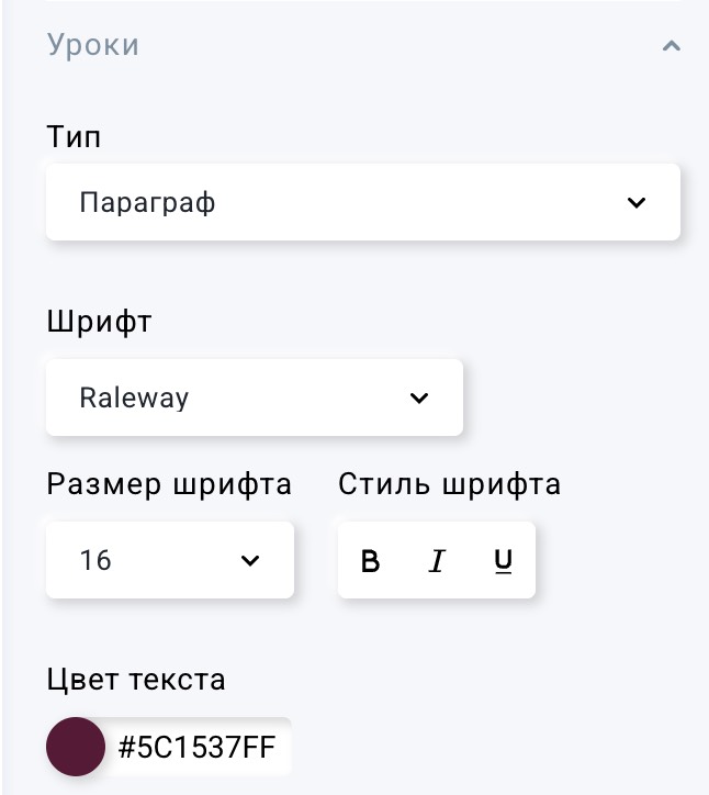 Вы можете редактировать стиль текста уроков: их тип, шрифт, размер шрифта, цвет текста, а также использовать жирный, курсив и подчёркивание.
