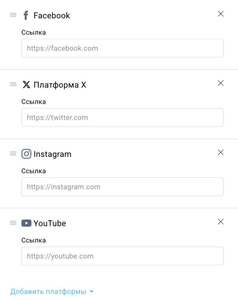 Другие платформы, которые можно добавить: LinkedIn, Pinterest, VK, Telegram, TikTok и WhatsApp.