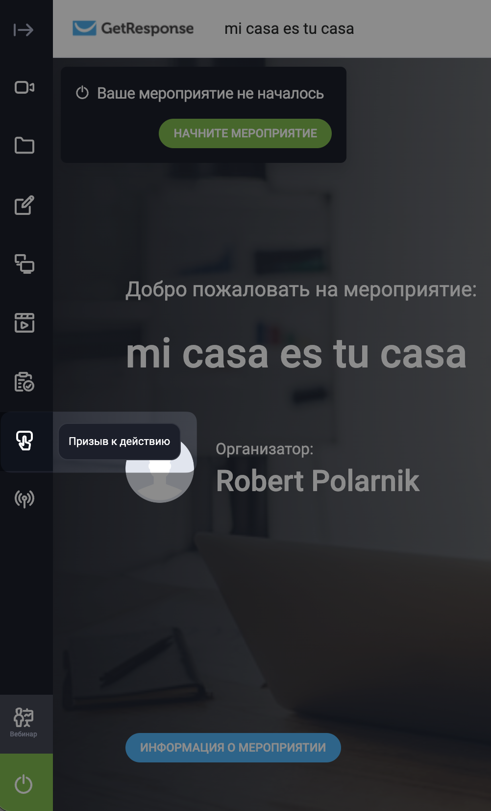 - В комнате вебинара нажмите Призыв к действию в меню слева.