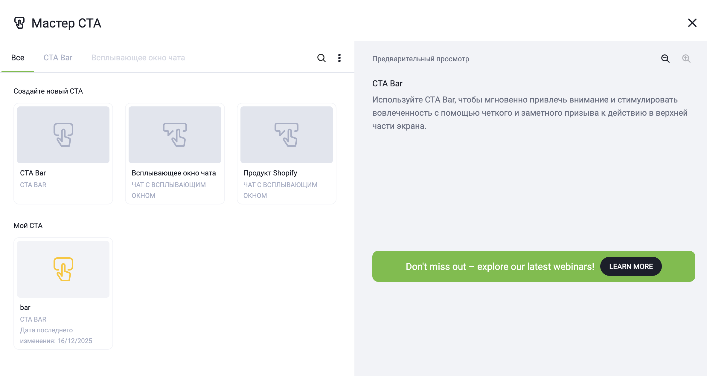 - выберите тип CTA — вы можете переключаться между CTA Bar и Chat Pop-up