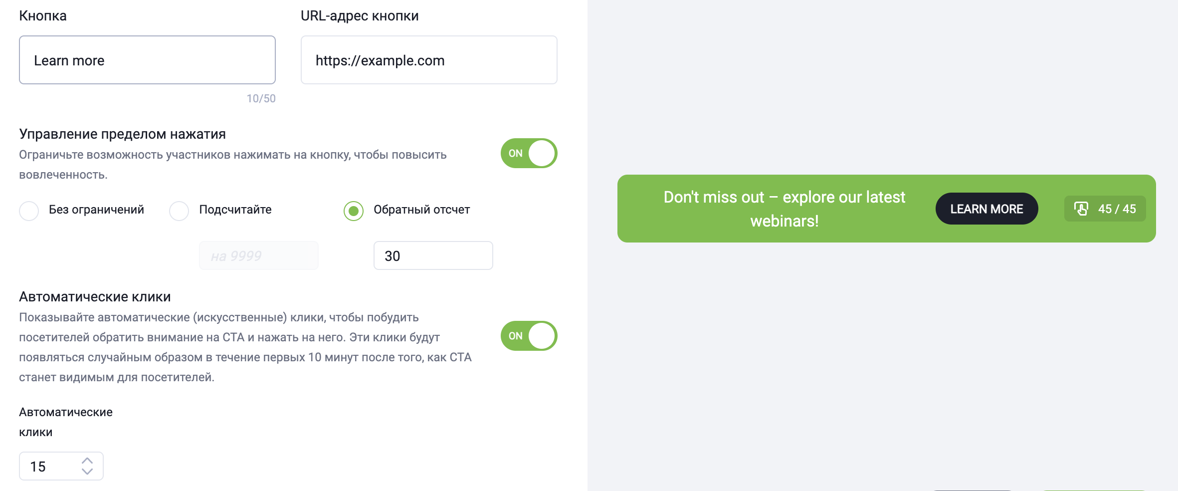 - Когда контроль лимита кликов включён, вы также можете активировать автоматические клики с помощью переключателя ON/OFF. Это создаёт имитированные (нереальные) клики для формирования ранней активности и стимулирования участников взаимодействовать с CTA. Эти искусственные клики добавляются сверх настроенного лимита кликов — например, если лимит установлен на 45 кликов, счётчик покажет 45 реальных кликов участников плюс дополнительные клики в зависимости от заданного вами количества. Искусственные клики распределяются случайным образом в течение первых 10 минут после того, как CTA становится видимым.