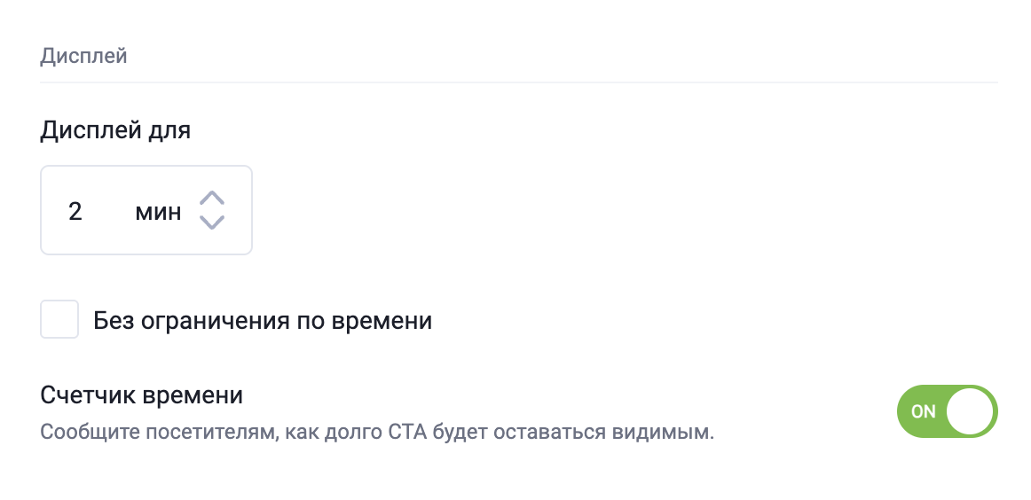 - В разделе Дисплей опция Без ограничения по времени включена по умолчанию, что означает, что CTA будет виден постоянно. Вы можете отключить эту опцию и задать, Без ограничения по времени, а также решить, нужно ли информировать участников о времени отображения CTA.
