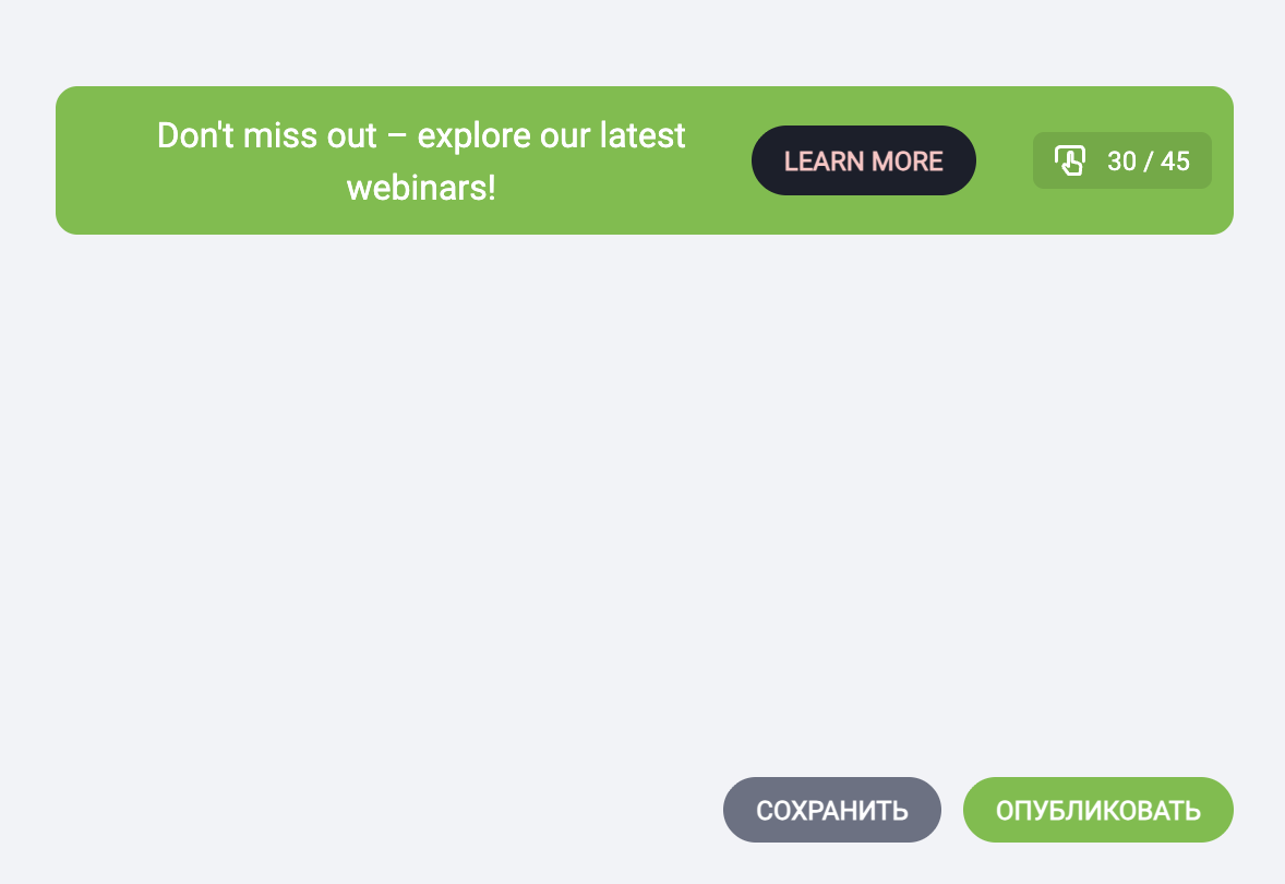 - Когда всё будет готово, нажмите СОХРАНИТЬ, чтобы сохранить CTA как шаблон, и/или ОПУБЛИКОВАТЬ, чтобы отобразить его сразу.
