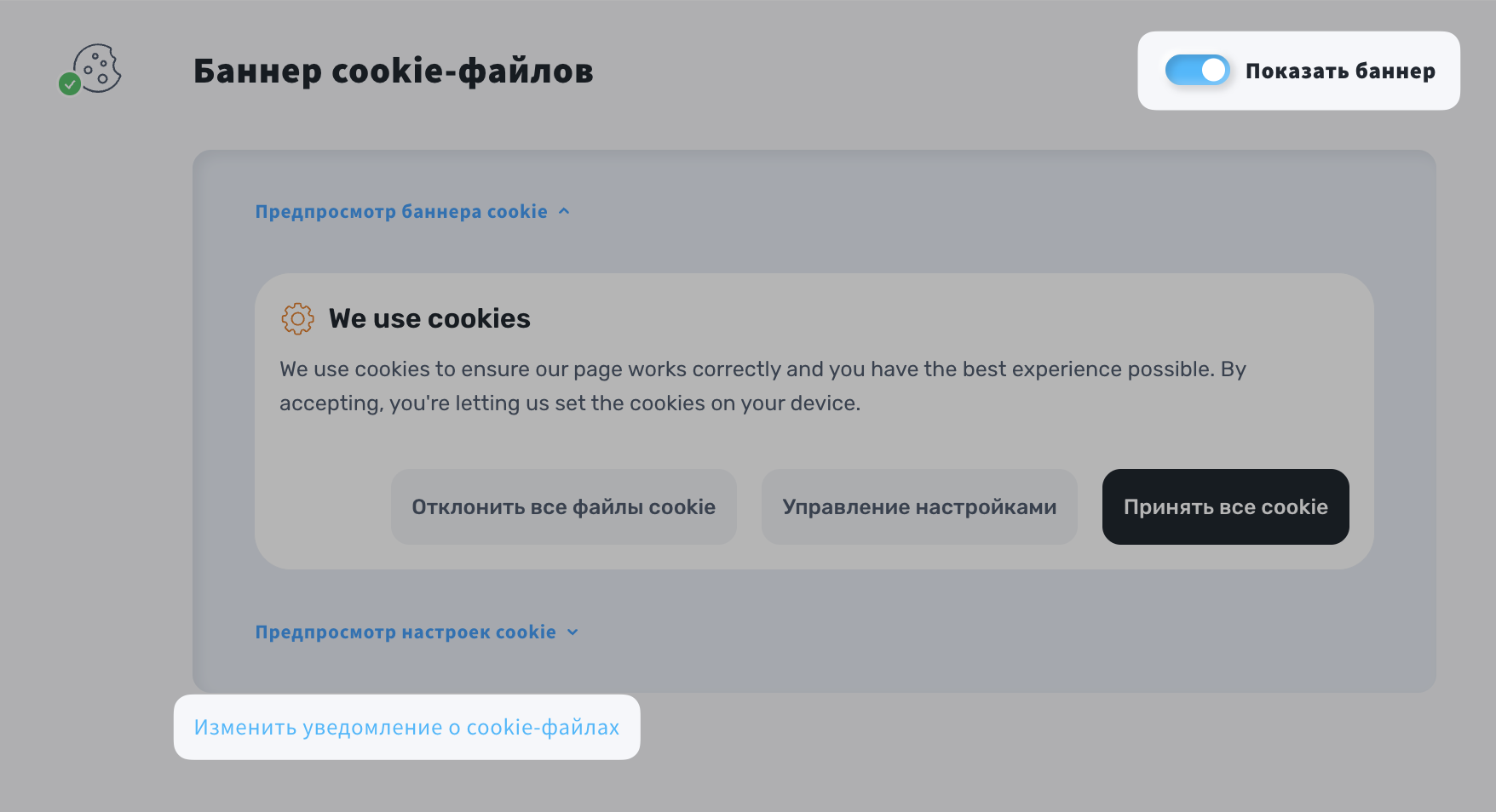 - Прокрутите страницу вниз до раздела Баннер согласия на использование cookies и включите опцию Показывать баннер.
