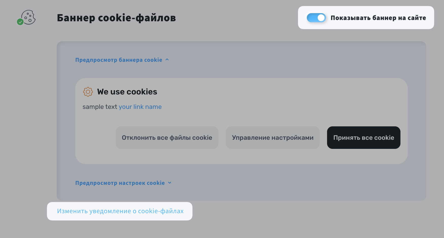 - Прокрутите страницу вниз до раздела Баннер согласия на использование файлов cookie и включите опцию Показать баннер.