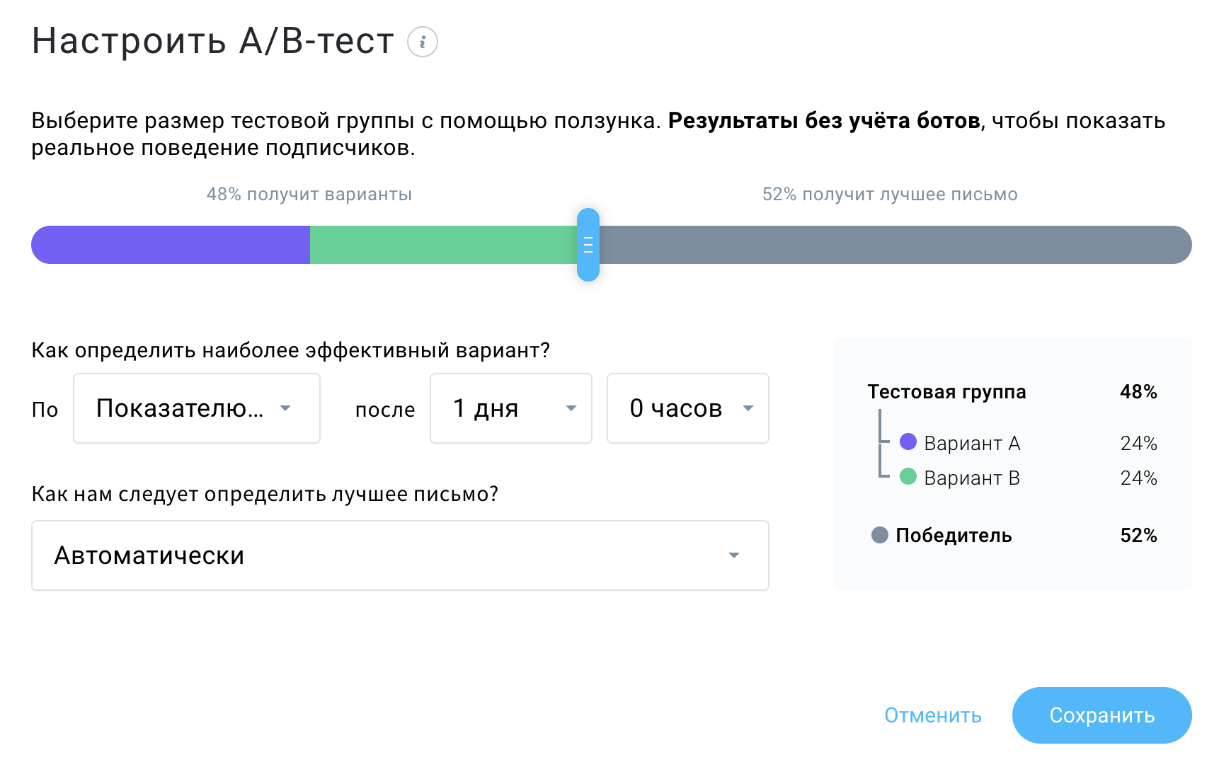 Мы предлагаем вам два типа A/B-тестирования. Вы можете проверить тему или содержание писем.