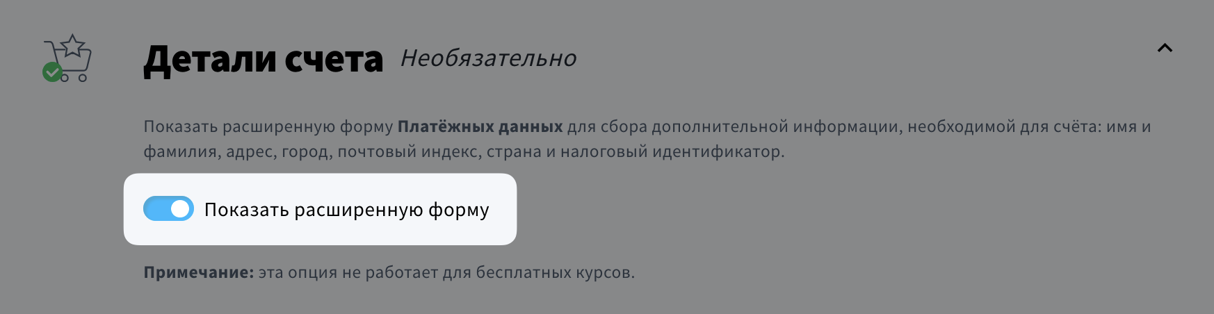 - Вы также можете включить расширенную форму данных оплаты, чтобы собирать название компании, ИНН/НДС и адрес. Данные отправляются напрямую в Stripe и доступны в аккаунте. Прокрутите вниз до раздела Детали счета и передвиньте ползунок рядом с Показать расширенную форму, чтобы включить её.